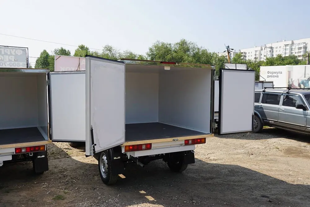 Описание для фургонаВнешняя обшивка – крашенная оцинкованная сталь, внутренняя обшивка - пищевая оцинкованная сталь, пол – рифлёный алюминий, портал - нержавеющая сталь. Двери - задние распашные. Запоры штанговые одинарные. Фургон выполнен под установку холодильного оборудования в Перми.